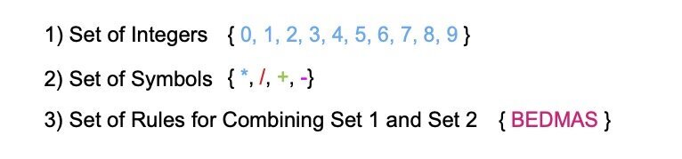 Now that we have the finite sets, we can combine them in as many ways as we want by following those rules, but always keeping in mind that division and multiplication comes before addition and subtraction in order to use this pattern language.