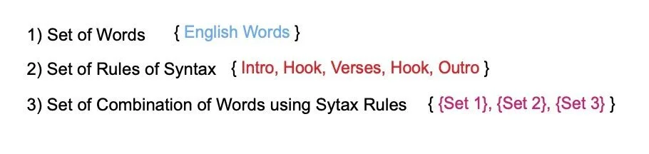 Using the set notation as was done earlier to attempt to describe simple math notation and the English language, rap pattern language can be divided into three parts